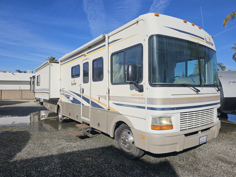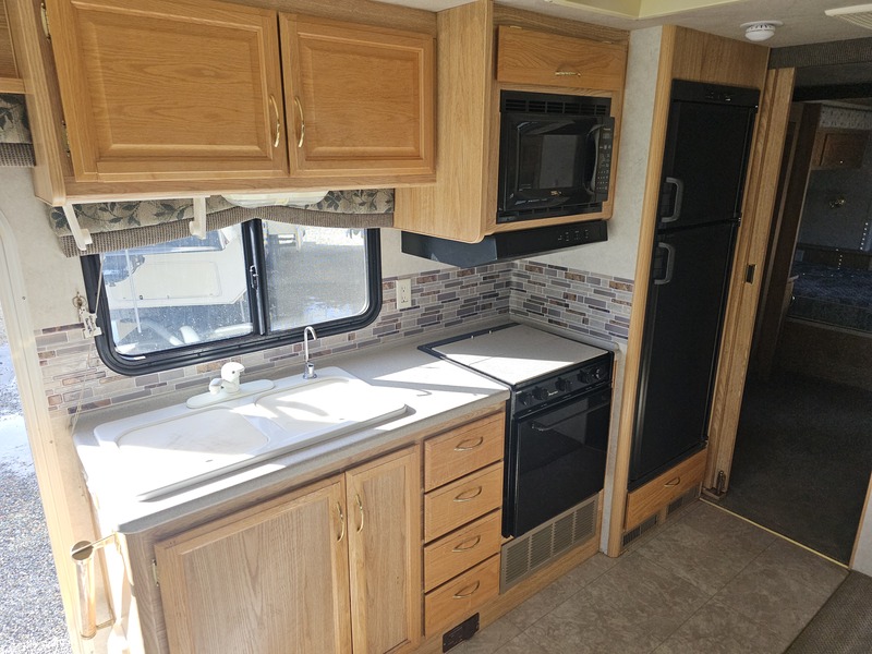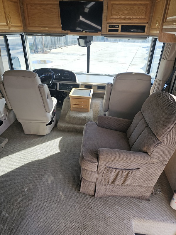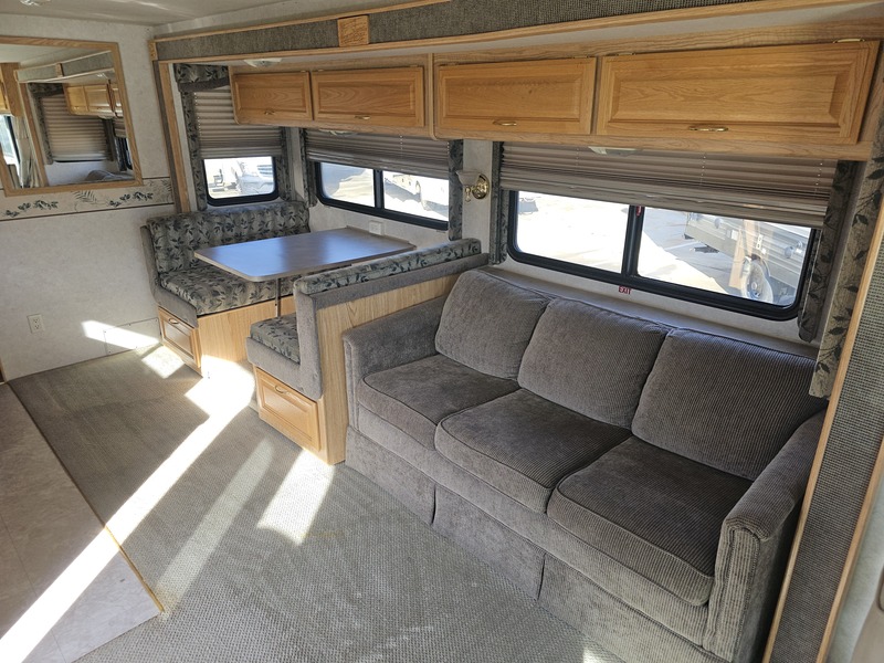 Large slide w/couch & dinette, recliner, mid-kitchen, side bath, wardrobe & queen bed slide, sleeps 6